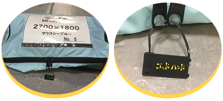 検品、清掃が終わった幕は、現場でバックから出しやすいよう丁寧にたたみ直し、スライトハンドで制作した専用バックに納めて、次の出番まで大切に保管しています。バックには封カンタグか付けられていて、保管管理も万全です。
